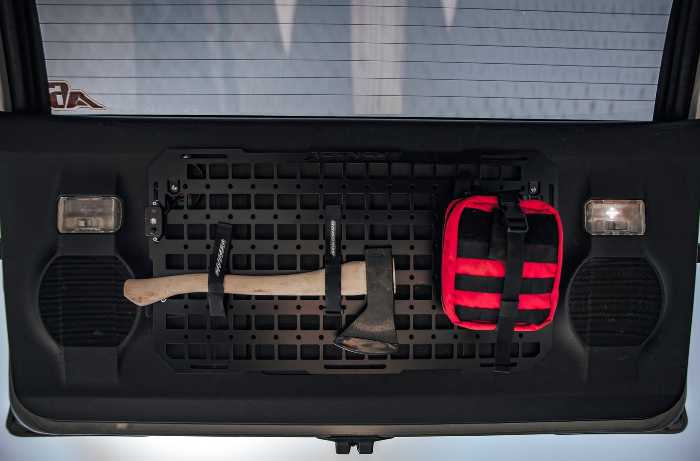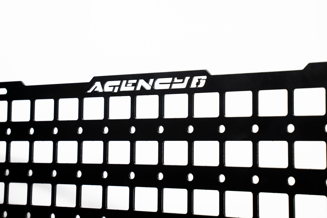 Tired of everything rolling around back there? Want to keep important equipment at the ready? Add organization to your 4Runner with the Agency 6 4Runner GRIDS panel. This rear storage solution gives you vertical real estate for mounting a variety of accessories. MOLLE pattern cutouts allow for a range of camping and off-road components to be securely strapped directly to the panels. Slots on the perimeter are ideal for mounting lights, or as additional strap points. Panel bolts through the plastic directly into existing metal structure utilizing machined aluminum adapters.