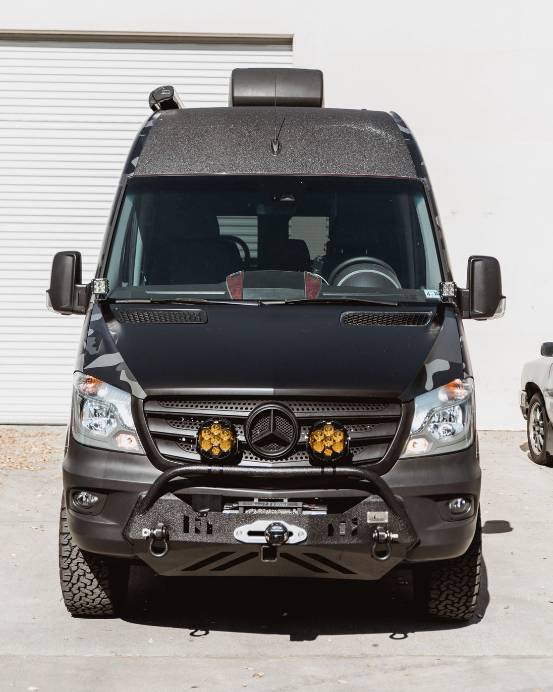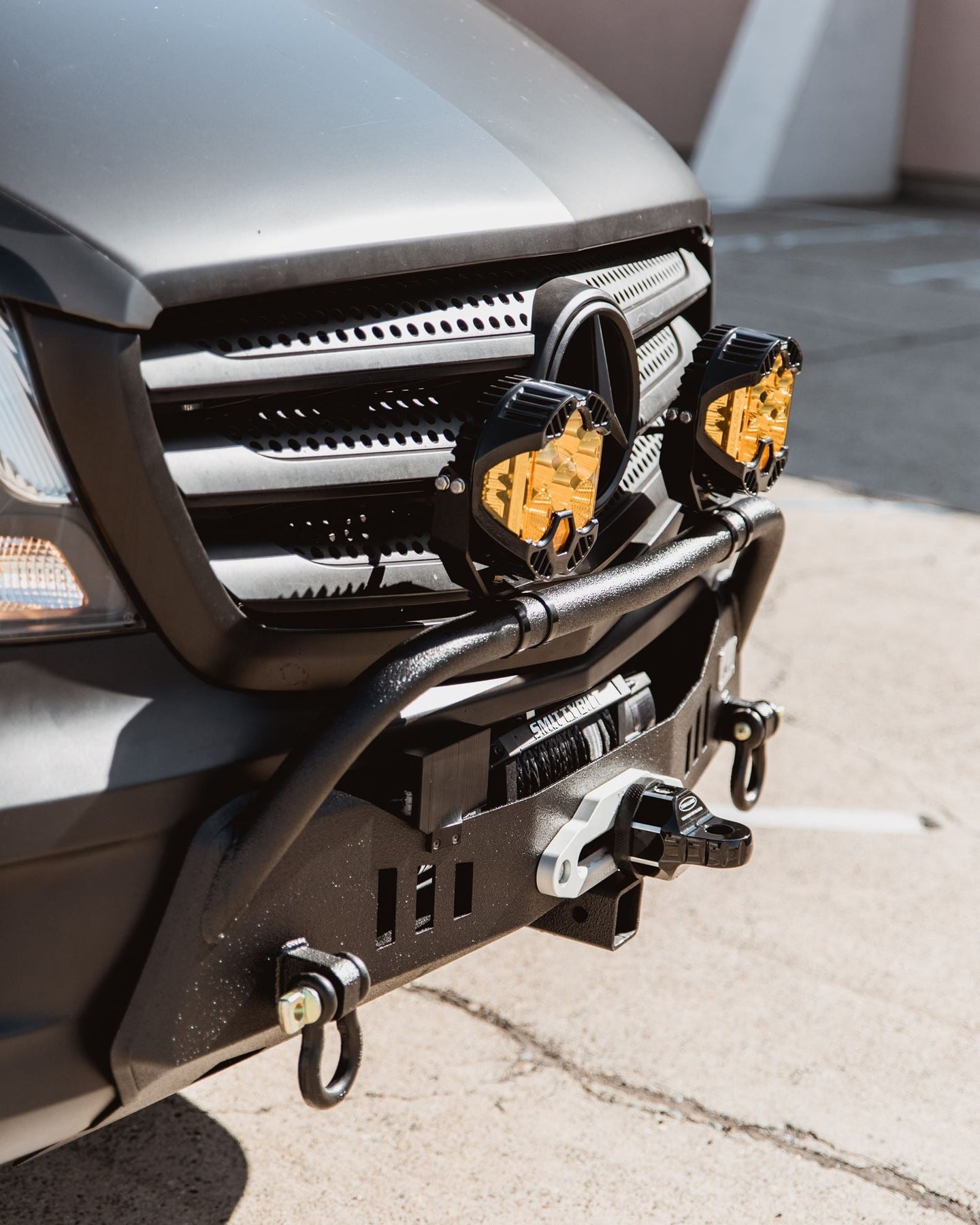 Clean and compact, this bumper walks the perfect line between being rugged and purposeful but not so big it destroys the lines of the Sprinter. All steel construction and welded/fabricated in California, it features an ultra-rugged design, additional front hitch, dual shackles, and is winch ready.