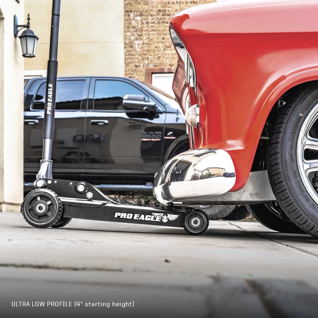 The Abrams shares the 3-ton lifting capacity with Kratos but is designed as a shop jack. It features a low-profile starting height of 4", making it suitable for a variety of vehicles (commuter cars, performance cars, hot rods and more). With a standard extended height of 1'8" (20"), it can reach up to 2'11.5" (35.5") with the optional 15" extension. Abrams does not come with an extension of any type. Accessories are sold separately.