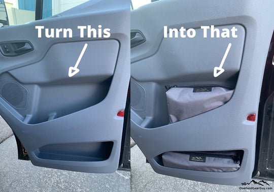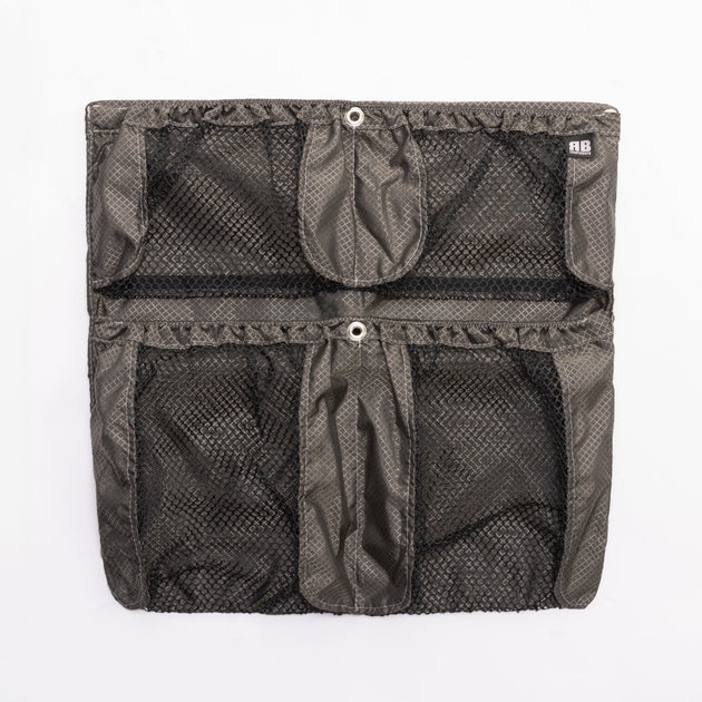 Driver and Passenger seat back storage now from RB Components. These seat back stuff bags are a great accessory to your van. The upper storage has an double enclosed zip in pouch while the lower storage compartment is a stretchable open mesh design that can be latched to keep items in place.