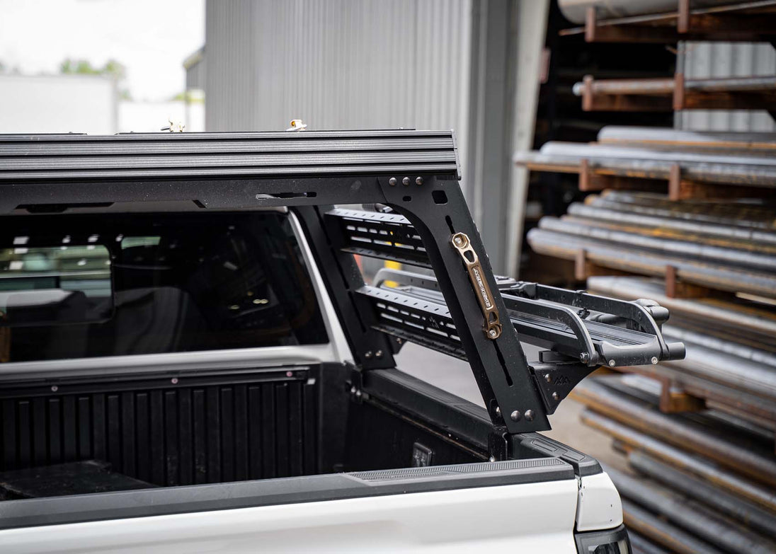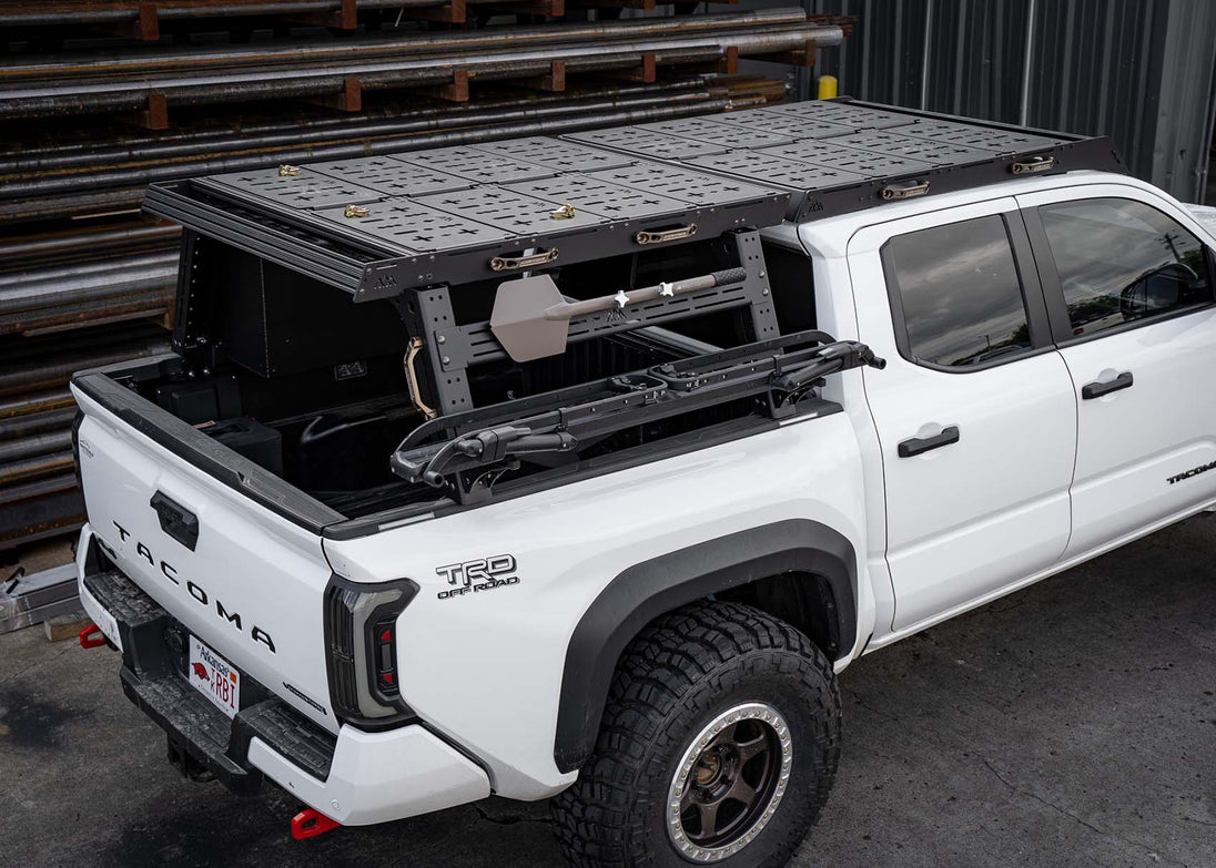 Our Toyota Tacoma bed rack gives you tons of customization and utility. Whether you're mounting a roof top tent, mountain bikes, kayaks, or other adventure gear, our modular roof rack helps you easily dial in your setup. On top of our bed rack, we have added an optional topper section that mimics the amazing features of our DRIFTR roof rack. The top of our bed rack comes with the same triple slotted extrusions, beefy 0.25" aluminum side panels, and handle cutouts as our roof rack. If paired with our DRIFTR roof rack, this bed rack creates a perfectly flat platform from the front to the back of the truck.